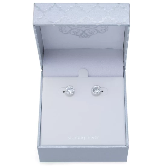 Wear these round fine crystal halo style studs earrings with any outfit. Crafted in fine sterling silver with post and friction back closure for comfort and safety.