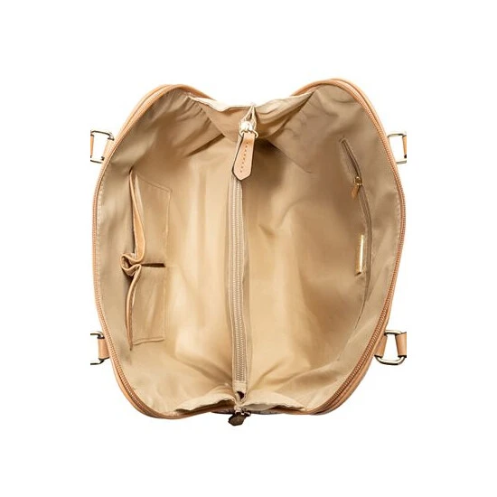 - Exterior features silver-tone hardware, logo plate, buckle details and 1 zip pocket