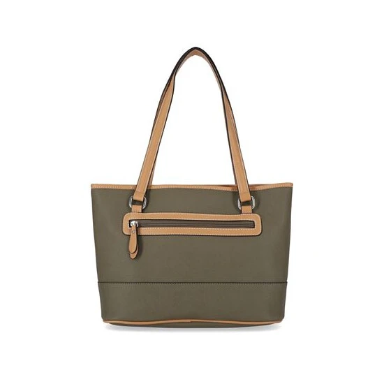 - Exterior features silver-tone hardware, logo plaque and 1 back zip pocket